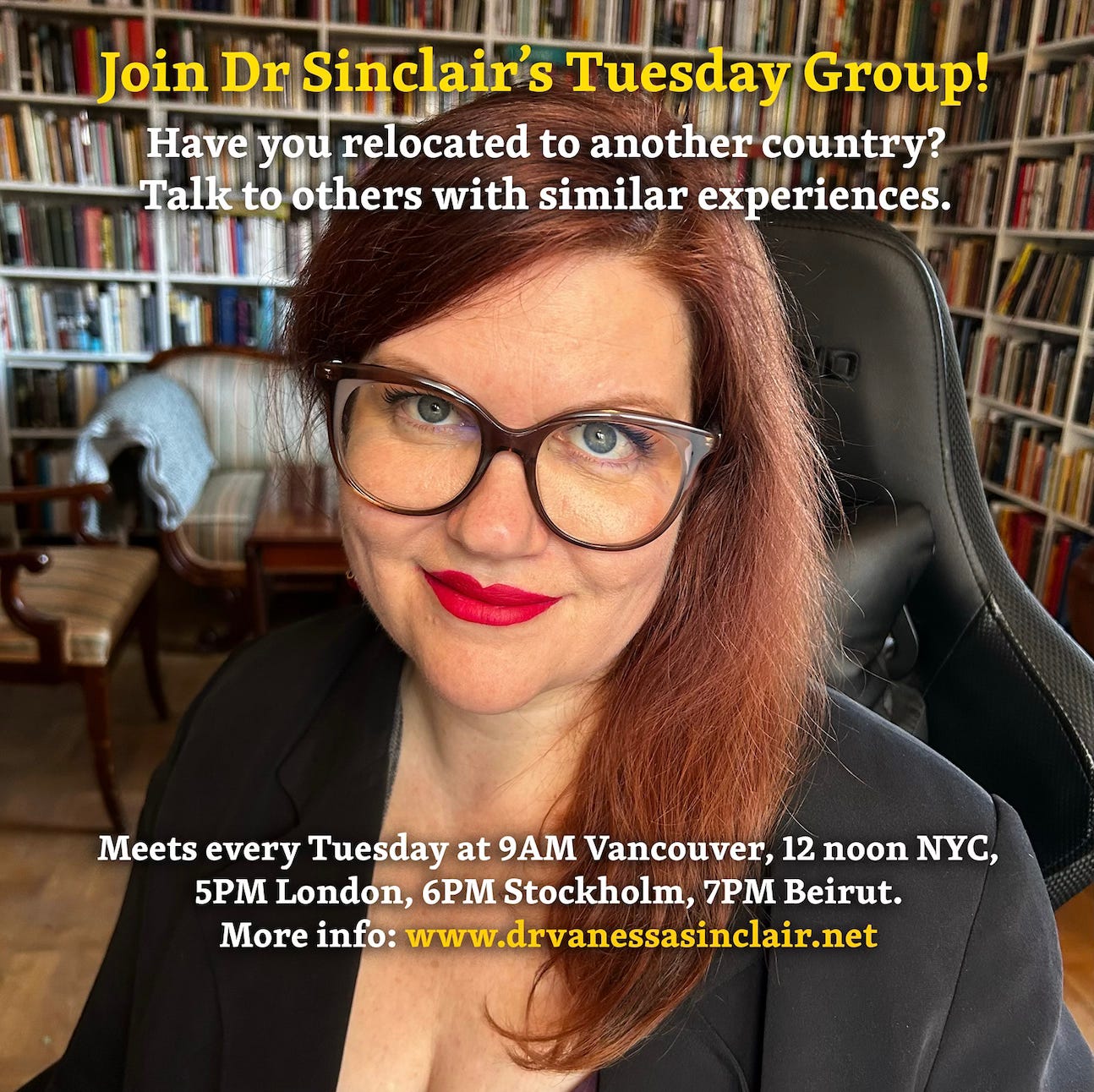 I also run a support group for people who have relocated to another country. If you have migrated or are thinking about moving, you are welcome to join us Tuesdays at 9AM Vancouver | 12 noon NYC | 5PM London | 18:00 Stockholm | 19:00 Beirut. We meet for 50 minutes. The group is in English and is a Palestine supportive space. You may find more information HERE.